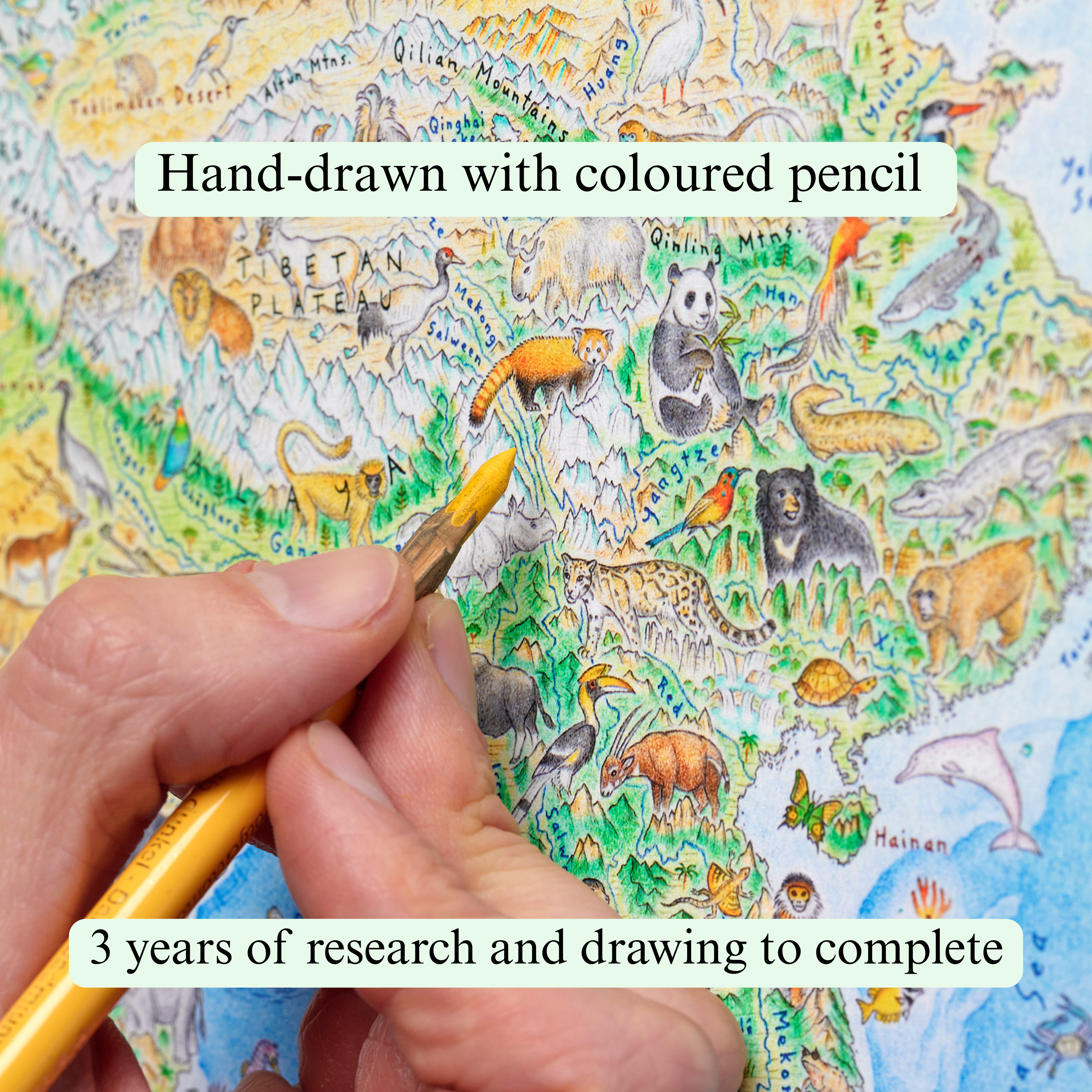 Wild World is a vast map of nature, hand-drawn with coloured pencil and pen. It took 3 years and thousands of hours to complete. It is both a captivating artwork and a highly accurate physical map. 1,642 wild animals roam the map and its vibrant landscapes. Designed to spark curiosity about nature, Wild World inspires the viewer to see the planet with fresh eyes.